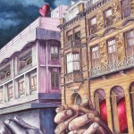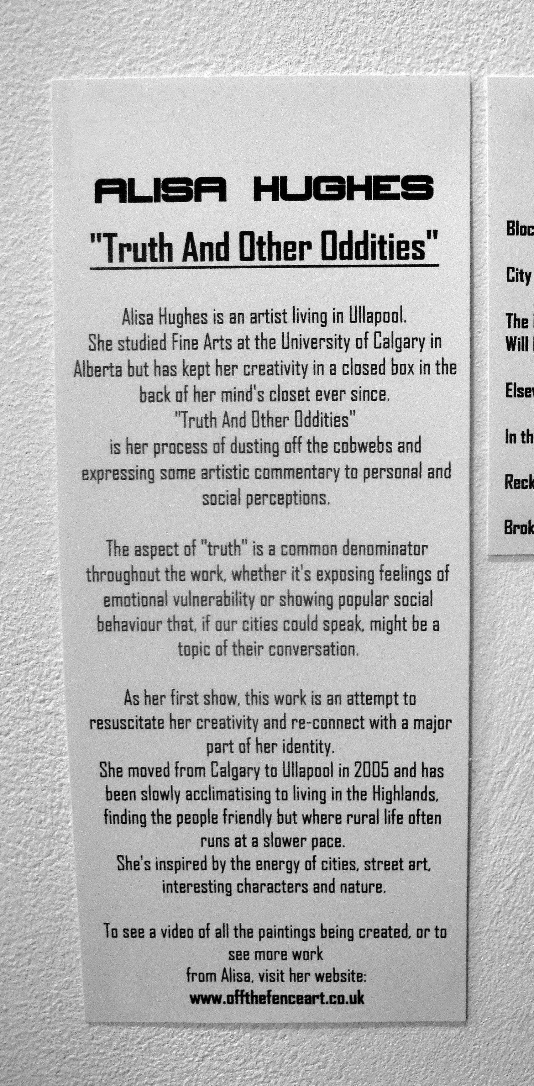 Paint brushes have been cleaned and canvases hung. Overall, I’m satisfied with the many hours invested for my “Truth and Other Oddities” show in Inverness. I’m still fleshing out my style in these early days, but a quirkiness and strangeness seems to have dropped anchor in every piece. I have to admit I like that.