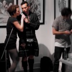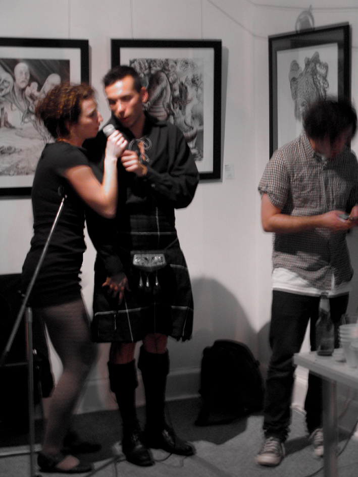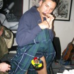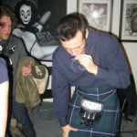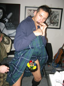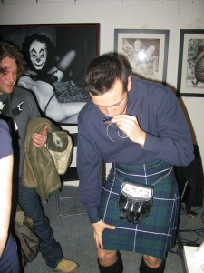 Fun party this past Wednesday for the closing night. Good turn-out at ig:lu. Everyone seemed to be in the mood to let loose… especially the two Canadian friends I have in town for the holidays. This is hardly art related but I just have to mention (with his permission) that one of the friends fulfilled a dream by buying a full kilt on day two of his Scottish adventure. He couldn’t wait to bust it out for the party, and boy did he ever. True to Scottish tradition (or so we’re lead to believe), he went commando under his kilt. I think he felt the need to prove it as the night went on.